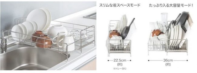 また、新商品として、「シンクに渡せる伸縮ステンレス ⽔切り(1段スリムワイド SUS-1SW)」を6月下旬に発売した。洗い物の量にあわせて、スリムな省スペースモードから、たっぷり⼊る⼤容量モードに変更できる伸縮タイプとなっている。