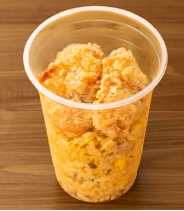 「チャーハン鶏から」は焼豚・たまご・ねぎを使用し、しょうゆ・塩・こしょうなどで味付けしたチャーハンに、ジューシーな唐揚げを2個トッピングした。