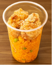 「チキンライス鶏から」は鶏肉とグリーンピースを合わせ、トマトケチャップで香ばしく炒めたチキンライスに、ジューシーな唐揚げを2個トッピングした。