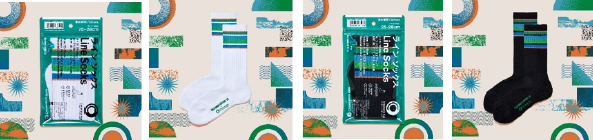 男女兼用のラインソックス。足底は、パイル編みの肉厚仕様で、ブランド名がプリントされている。抗菌防臭加工でニオイにくい仕様になっている。サイズは22-25㎝、25-28cm、価格は500円。