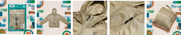 小松マテーレ社の「ダントツ撥水®」素材を使用したはっ水パーカー。圧倒的な撥水性と耐久性を兼ね備えており、胸ポケットに本体が収納できるので、コンパクトに持ち運べる。サイズはM・L、価格は4389円。