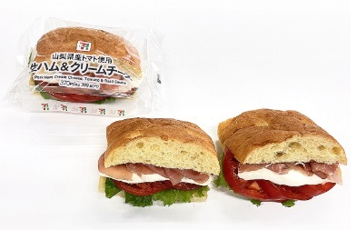 肉厚で味わいの濃さが特長の山梨県産トマトを使用。生ハムやクリームチーズなどと一緒にサンドした。370円。