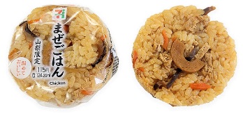 鶏肉、にんじん、ごぼう、ちくわ、しいたけを混ぜ込んだごはんをおむすびにした。山梨県で愛される味わい。115円。