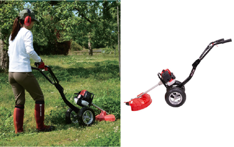真夏の農作業は、熱中症と隣り合わせの大変な作業。一般的なエンジン式の刈払機の重さは約5kg、それを使って広範囲の草を刈るのは、腰や肩に大きな負担がかかる。「手押し草刈機 K-28T」は通常の刈払機とは異なり、持ち上げる必要はなく、地面を押し進めることで楽に草刈りができる。