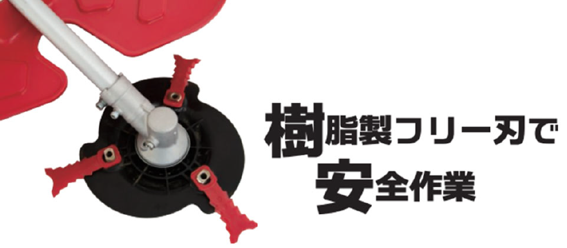 刈払機の刃として一般的に採用されているナイロンコードは、障害物に当たった際に起こるキックバックによる反動が少なく、安全性が高いとされているものの、太めの雑草が一度で刈り切れないといったデメリットもある。この商品にはバランスの良い樹脂製フリー刃を採用しており、安全性と切れ味を両立することができる。樹脂製フリー刃は、障害物に当たった際の衝撃を逃すことでの安全性と、ナイフ形状の刃の採用で、雑草を切断することに長け、切れ味にも期待ができる。