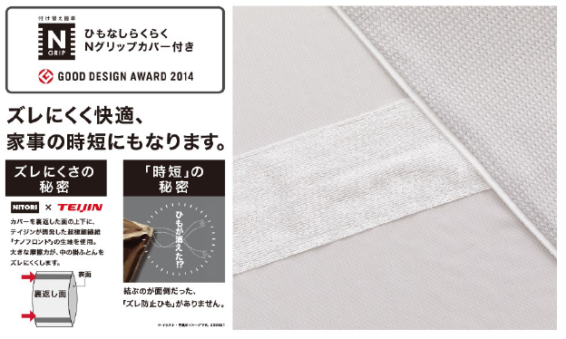 さらに、カバーはひもが無い、付け替え簡単なNグリップ®仕様となっている。カバーを裏返した⾯の上下に、⼤きな摩擦を⽣み出す⽣地を使⽤することで、中の布団をズレにくくしている。⾯倒なカバーの付け替えも楽になり、時間も短縮できる。