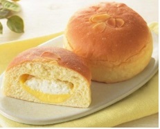 大分県産ゆず果汁入りの甘いカスタードクリームをパン生地で包み、酸味のあるゆず果汁とほんのり辛味のあるゆず胡椒をアクセントに加えた、ホイップクリーム入りのクリームパン。140円。