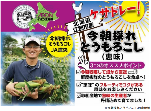 流通スーパーニュース > 新商品 > イオン北海道news|地産地消「今朝採れとうもろこし」55店舗で販売中 イオン北海道news|地産地消「今朝採れとうもろこし」55店舗で販売中 新商品 / 2023年08月07日 ツイート イオン北海道(株) (札幌市白石区、青栁英樹社長)は、道内の「イオン」「マックスバリュ」など55店舗で、その日の朝に収穫された「今朝採れとうもろこし」を順次、販売する。 帯広市と近郊店舗ですでに7月下旬から販売していて、8月28月2日(水)からその他の店舗で順次取り扱っている。販売価格は本体価格128~178円。 イオン北海道は地産地消や産地開発の取り組みを進めていて、「今朝採れとうもろこし」はその一環になる。 ツイート