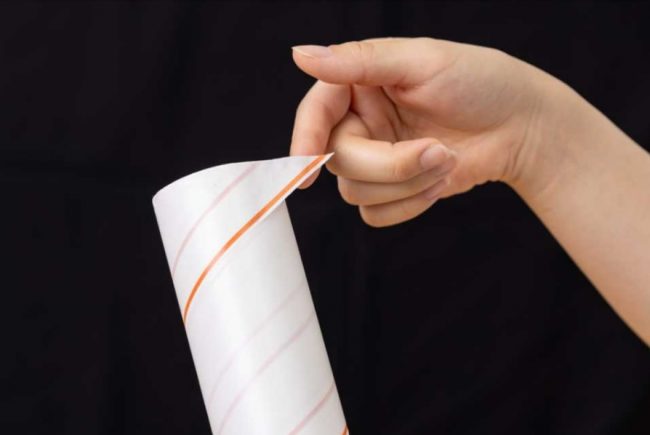 今回発売された「斜めカット粘着クリーナー スペアテープ カーペット用」は、らせん状にテープがカットされているので、端をつまんで引っ張るだけでめくることができる。