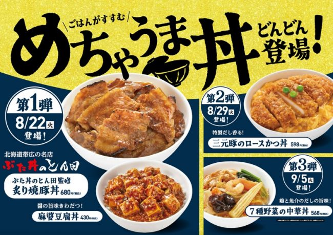 第1弾では、北海道の帯広で人気の名店「ぶた丼のとん田」監修の「炙り焼豚丼」と、醤のコク深い旨味がきわだつ「麻婆豆腐丼」を発売する。