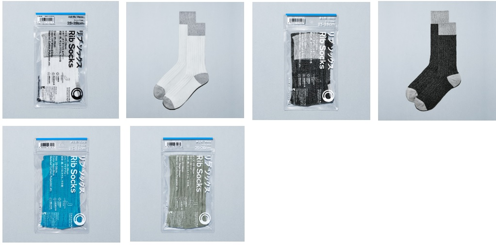 紳士用のリブソックス。足底は、通気性が良い鹿の子編みで仕上げた。つま先、かかとには補強糸を使用し、耐久性を高めた。抗菌防臭加工付きでニオイにくい。カラーはオフホワイト&グレー、チャコール&グレー、アクアブルー、セージの4色、価格は429円。