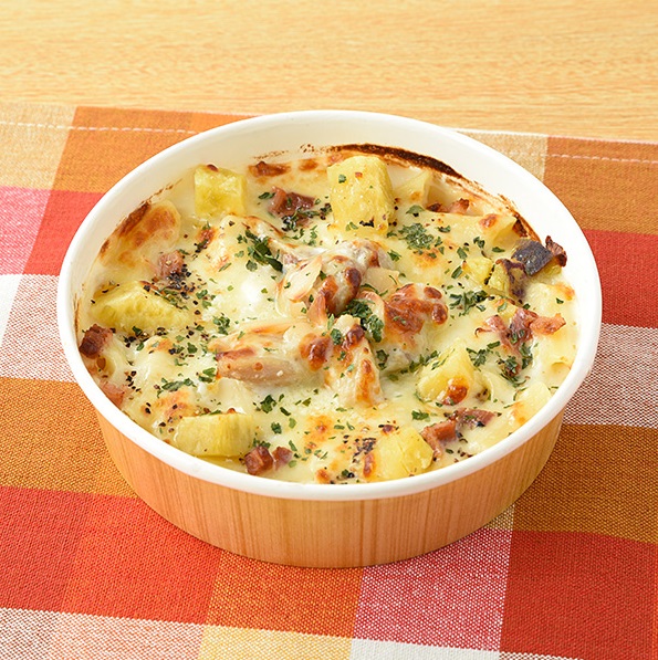 秋の味覚であるさつまいもと、チキン、マカロニが入った、ごろごろ食感が特長のグラタン。ホワイトソースは、炒めた鶏皮に牛乳などを加えてクリームソースに仕立てることで、ソースと具材の一体感がアップした。アクセントにスモークしたベーコンとスライスアーモンド、ブラックペッパーを入れることで、美味しさを引き立てた。価格は508円(税抜き、以下同じ)。