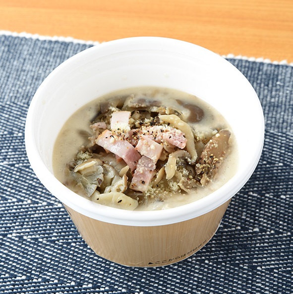 ふわっと広がるきのこの香りが楽しめる、とろっと濃厚な味わいのクリームスープ。ベーコンやトリュフオイルを使用することで、スープのコクや香りを引き立てている。プチプチ食感が癖になる押麦やぶなしめじ、まいたけ、マッシュルームを入れ、食べ応えある一品に仕上げた。369円。