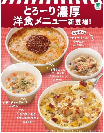 朝晩と日中の気温差が大きくなりはじめるこの時期に、グラタン、ラザニア、スープなどのほっと温まる4種類のクリーム系の洋食メニューを用意した。気温が下がり、秋の訪れを感じるときに「とろっとした濃い味のものを食べたい」というニーズを満たしつつ、一口食べたときに「美味しい」と感じてもらえる商品を目指し、ソースの配合や口当たりの良い濃度、具材感、食べ応えにこだわった。