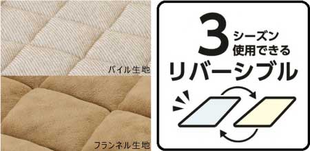 寒さが厳しい冬には「フランネル面」を、春・秋などの季節の変わり目には「綿混パイル面」を使用することで3シーズンにわたる長い期間、使うことができる。カラーはベージュとピンクの2色。シングルサイズが1980円(税込み、以下同じ)、セミダブルサイズが2480円、ダブルサイズが2980円。