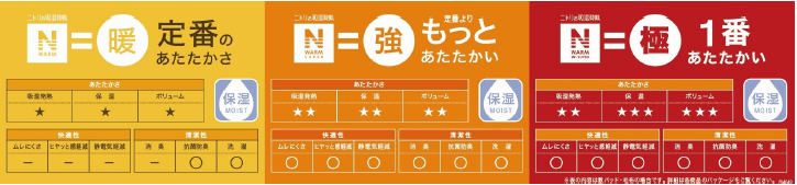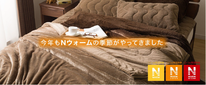 「Nウォーム」とは、体から発散される⽔分を、熱に変える吸湿発熱素材を使⽤した商品のこと。肌に触れた部分からじんわり、あたたかくなる。定番のあたたかさの「Nウォーム」、もっとあたたかい「Nウォームスーパー」、1番あたたかい「NウォームW(ダブル)スーパー」の3シリーズを⽤意する。3シリーズすべて、抗菌防臭機能と保湿機能つき。ポリエステル生地に比べて⽔分率が約5倍の⽣地を使⽤しているので、肌ざわりはしっとりしている。