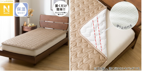 ゴムバンドがないので⾒た⽬はスッキリしている。付け外しがラクでこまめに洗濯したい人におすすめの敷パッド。昨年モデル同様、すべり⽌めをクロスに配置してあるのでずれにくい。シングルサイズ(幅100×奥⾏200㎝)のみ。Nウォームは2490円、Nウォームスーパーは3490円、Nウォームダブルスーパーは4490円。