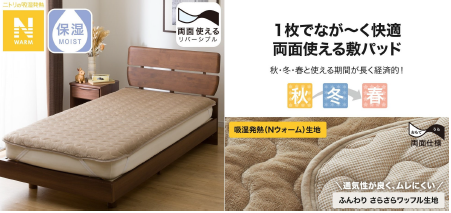 ゴムバンド付きでずれにくい。表⾯はNウォーム⽣地であたたかく、裏⾯はワッフル⽣地(NウォームとNウォームスーパー)/パイル⽣地(Nウォームダブルスーパーのみ)のリバーシブルで、1枚で秋から冬、春まで3シーズン使える。シングルサイズ(幅100×奥⾏200㎝)のみ。Nウォームは2490円、Nウォームスーパーは 3490円、Nウォームダブルスーパーは4490円。
