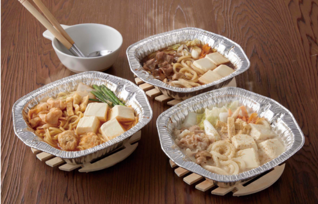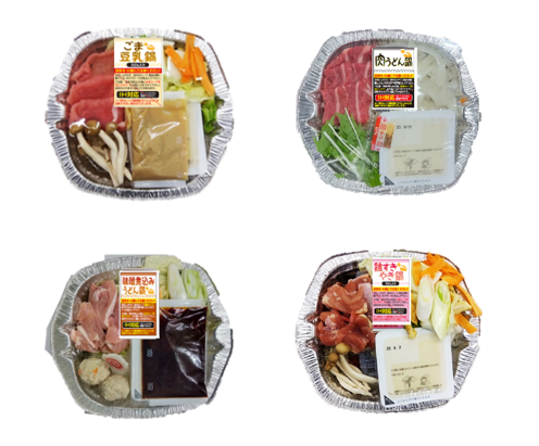 「牛すきやき鍋」「キムチ鍋」「鶏ちゃんこ鍋」などの定番商品に、2023年版は「ごま豆乳鍋」「味噌煮込みうどん鍋」「肉うどん鍋」「鶏すきやき鍋」の4種類の新商品がラインアップに加わった。