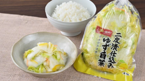 二度の下漬けで国産白菜の旨みをじっくり凝縮させたことで塩の角が取れ、どの年代でも食べやすい。塩分は30%カットしてあり、体にもやさしい。国産ゆずの皮を加え風味豊かに仕上げた。定番の白菜漬シリーズからの期間限定商品。180g入り、170円。平和堂151店舗、エール2店舗、丸善5店舗で販売している。