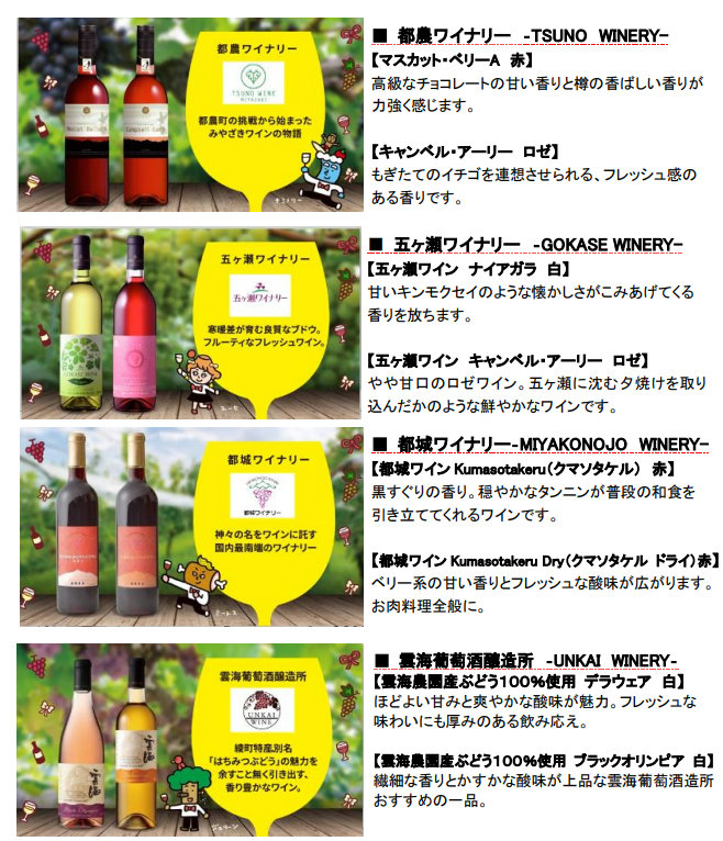 イオン九州(株)(福岡市博多区、柴田祐司社長)が参画する”みやざきワイン”推進実行委員会は、宮崎県内4つのワイナリーでつくられた今年の新酒を10月21日(土)に解禁する。また解禁日には、4年ぶりに「みやざきワイン解禁セレモニー」を実施する。
