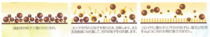 「コロイド」とは、電荷をもった顕微鏡でも見えない、1千万分の1cmのサイズの超微粒子と呼ばれる反微視的粒子。コロイド活性機能により、汚れは磁力のような作用でコロイドに引き付けられ、コロイドが汚れを個々の粒子に取り組み、遊離させ、再び付着する力を喪失させる。遊離した汚れの粒子を水で洗い流すか、ふき取ることで高い洗浄力を実現する。