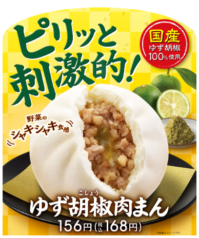 国産ゆず胡椒を100%使用した、爽やかなゆずの香りとあと引く辛さが特長の中華まんだ。九州産ゆず胡椒と四国産のゆず皮を使用して、柚子の香りと青唐辛子の辛味のコンビネーションが楽しめる味に仕上げた。また豚肉の旨味、玉ねぎや白ねぎの野菜の甘み・旨味に、クワイのシャキシャキ食感がアクセントになっている。