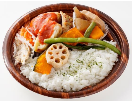 主食(ご飯)、主菜(ひき肉のキャベツ包み、ローストチキン)、副菜(ごぼうサラダ、キャロットラペ、野菜ステーキ、煮物)が入った536kcalの弁当で、栄養価の基準を満たしている。税込価格646円。販売期間は11月1日(水)~11月末を予定している。