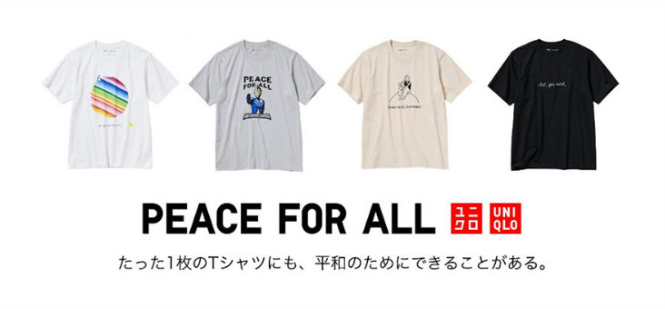 「PEACE FOR ALL」は、「世界の平和を心から願い、アクションする」という趣旨に賛同した著名人にボランティアで協力を依頼し、それぞれの平和への願いをデザインしたTシャツを販売するもの。このプロジェクトの主体である(株)ファーストリテイリングが、1枚当たり販売金額の20%相当の利益を、貧困、差別、暴力、紛争などで影響を受けた人々に対して人道的支援を行っている団体に寄付している。