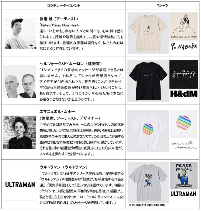 ホリデーコレクションのコラボレーターは4組。国内外で活躍するアーティストの長場雄は描き下ろしで「心の絆」を表現したデザインを提供する。プリツカー賞を受賞し、UNIQLO TOKYOの内外装を手がけた世界的な建築家のヘルツォーク&ド・ムーロンは、シンプルなデザインにメッセージを込めている。さらに世界中のユニクロ旗艦店で実施したインスタレーションが話題を呼んだ建築家・アーティスト・デザイナーのエマニュエル・ムホー、そして幅広い世代から人気のあるウルトラマンによるオリジナルグラフィックが登場する。