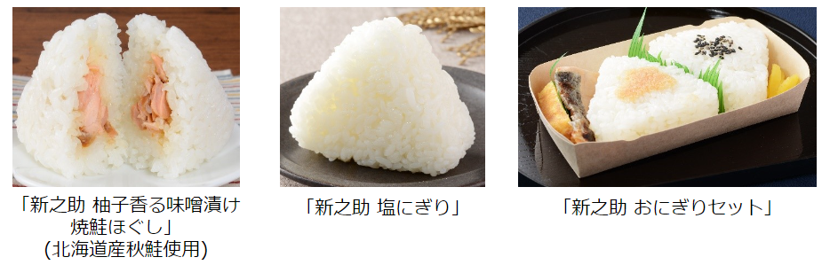 「新之助 柚子香る味噌漬け焼鮭ほぐし(北海道産秋鮭使用)」181円(税込価格、以下同)、「新之助 塩にぎり」113円、「新之助 おにぎりセット」343円。