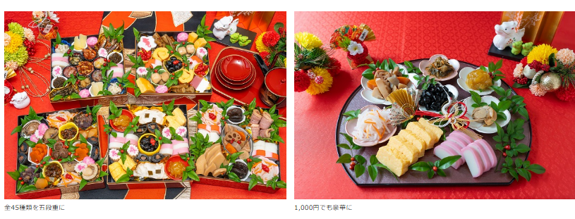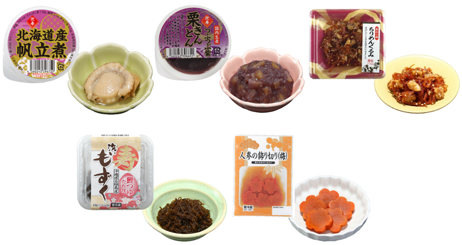「つぶつぶ紫栗きんとん」は人気の高い「栗きんとん」のシリーズ品としてラインナップに追加。「ちりめんくるみ」は、ちりめんの佃煮を、はちみつ、くるみと合わせた。「沖縄県石垣島産洗いもずく 鰹つゆたれ付」は、食味・食感に特徴がある沖縄県石垣島の洗いもずくを使用している。「人参の飾り切り(梅)」は、おせちの色味のアクセントとして人参を梅の形に型取り、鰹の和風だしで仕立てている。
