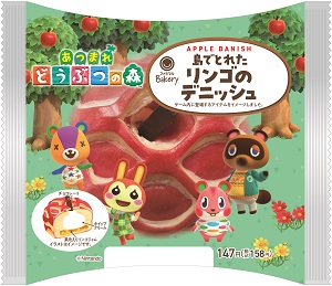 ゲーム内に登場する島の特産フルーツ「リンゴ」からヒントを得た赤い色のデニッシュ。デニッシュ生地で果肉入りりんごジャムとホイップクリームを包み、アクセントとしてリンゴのヘタをイメージした棒チョコを刺した。158円(税込み、以下同じ)。