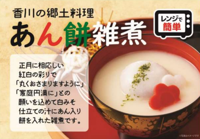 同商品は、高松市にある中屋醸造所のさぬき白味噌と観音寺市にある「やこや」のあん餅を使用し、金時人参と大根はかつおだしで味付けした。ほんのり甘さのある白味噌とあん餅の絶妙なバランスの味を楽しめるのが特徴だ。