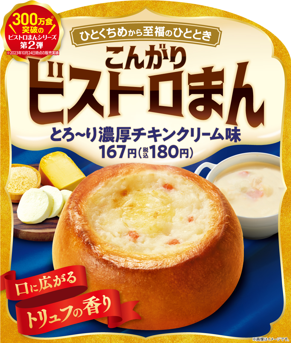 第2弾となる「こんがりビストロまん とろ~り濃厚チキンクリーム味」は、チキンクリーム味のホワイトソースに、黒トリュフ塩とトリュフオイルを配合しトリュフの香りがアクセントのチーズ、香ばしい生地が相性のよい商品。伸びのあるモッツァレラチーズと旨みのあるゴーダチーズ、コクのあるパルメザンチーズ、カマンベールチーズなどの焼きチーズをバランスよく配合した。税込み価格は180円。