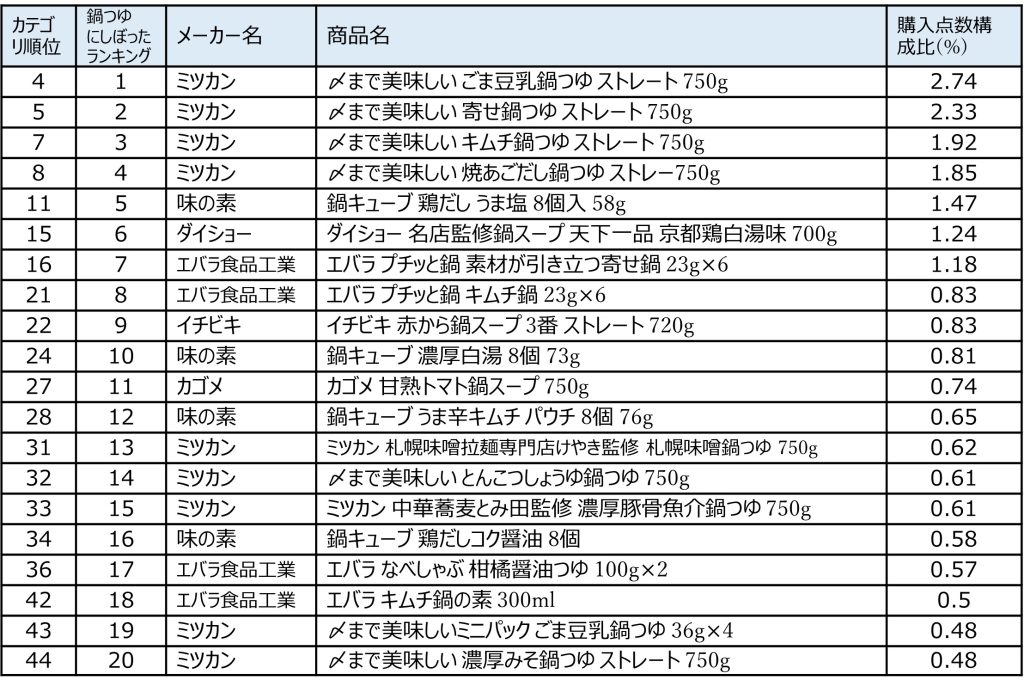 TOP20の1位は「〆まで美味しい ごま豆乳鍋つゆ ストレート 750g」、2位「〆まで美味しい 寄せ鍋つゆ ストレート 750g」、3位「〆まで美味しい キムチ鍋つゆ ストレート 750g」、4位「〆まで美味しい 焼あごだし鍋つゆ ストレート 750g」と1位から4位までミツカンの商品が占めた。ミツカンの「〆まで美味しい」ブランドの商品はTOP20内に7商品ランクインしていて、人気が高い。