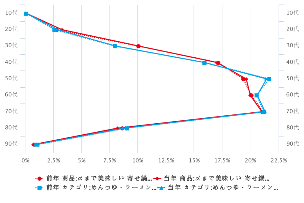 2位の「〆まで美味しい 寄せ鍋つゆ ストレート 750g」を購入している人の年齢層は50代から70代と高齢者層が多く、幅広い世代に購入されている。ミツカンでは鍋の〆として王道のご飯を使った雑炊をお薦めしている。