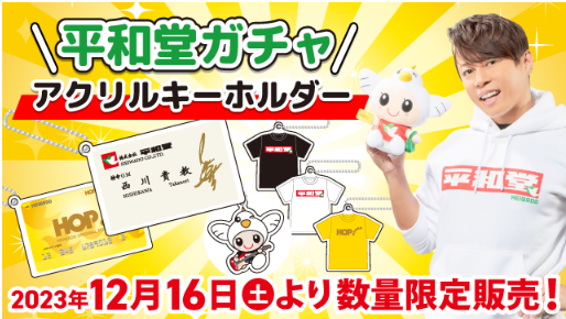 (株)平和堂のグループの(株)ユ~イング(滋賀県彦根市、藤田慎平社長)は12月16日(土)から、平和堂22店舗で「平和堂ガチャ『平和堂限定 アクリルキーホルダー』」を数量限定で販売している。