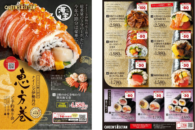 (株)三越伊勢丹ホールディングス(東京都新宿区、細谷敏幸社長)のグループ会社でクイーンズ伊勢丹を運営する(株)エムアイフードスタイル(東京都新宿区、雨宮隆一代表取締役社長)は、12月20日(水)からネットショップ先行で「クイーンズ伊勢丹の恵方巻ご予約承り会」を開始する。