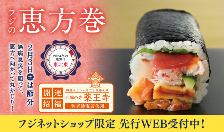 (株)フジ・リテイリング(愛媛県松山市、山口普社長)は12月26日(火)から2024年1月26日(金)の間、「フジの恵方巻」の受け付けを店頭およびフジネットショップで開始する。