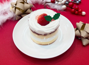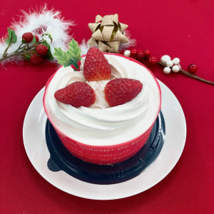 スポンジ生地にホイップクリーム、ストロベリーソース、フレッシュな苺を3つ合わせた王道のショートケーキ。クリームのしさにこだわ乳脂肪47%の濃厚な北海道産生クリームを配合したオリジナルクリームを使用した。クリームのおいしさにこだわった。家族でシェアして楽しめる。直径約12cm、1580円。