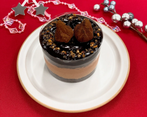 ココアスポンジにチョコムース、艶のあるグラサージュショコラを合わせた3層仕立てのチョコレートケーキ。生チョコトリュフを2つトッピングした。チョコ尽くしのクリスマスにぴったりのひと品。直径約9cm、498円。