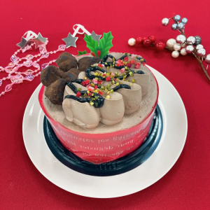 スポンジ生地とチョコホイップクリームをベースにしたチョコレートケーキ。生チョコトリュフやフリーズドライストロベリー、ピスタチオ、チョコソースをトッピングしてでクリスマスらしく華やかに仕上げた。直径約12cm、1580円。