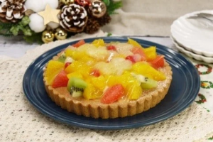カスタードホイップクリームの上にごろっと大きなピンクグレープフルーツ、オレンジ、キウイ、マンゴー、パイナップル、白桃、グロゼイユといった7種のフルーツをトッピングした、みずみずしい華やかなフルーツタルト。直径約15cm、980円。