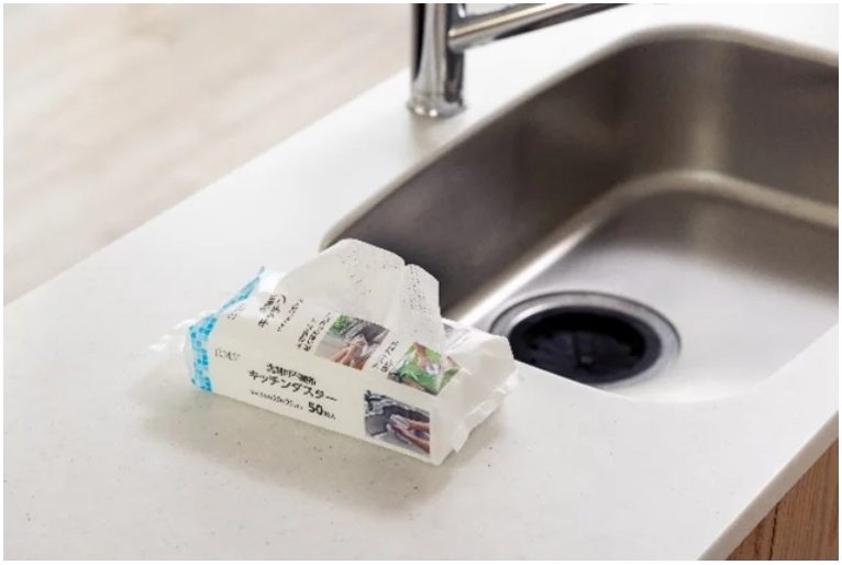 「洗剤付不織布キッチンダスター」は、あらかじめダスターに洗剤が付いているため、水に濡らして軽く揉むことで泡立つ。室内・屋外ともにシーンを選ばず、食器を洗うことができる。また、使い終わった後はふきんとして使えるだけではなく、そのままゴミ箱に捨てることも可能だ。またかさばらず、携帯したすい。