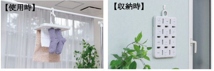 商品のポイントは、①洗濯物を干す時は差し込むだけ、取り込むときは引っ張るだけの洗濯バサミのない新しい形状(実用新案及び意匠取得済)。②洗濯バサミ代わりになる部分は柔らかいシリコン製で、洗濯物を傷めずしっかり挟める。 ③洗濯バサミがないことで畳みやすく、コンパクトにまとまるため収納も簡単。