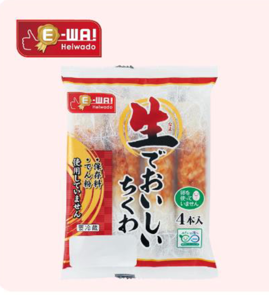 「E-WA!生でおいしいちくわ」は、2016年に販売を開始した。魚のすり身本来の味わいと弾力が人気のロングセラー商品だ。アレンジメニューの幅が広く、お手軽一品料理やおやつにも適している。また保存料・卵・でん粉を使用していないため、健康志向の人や子どもも安心して食べられる。