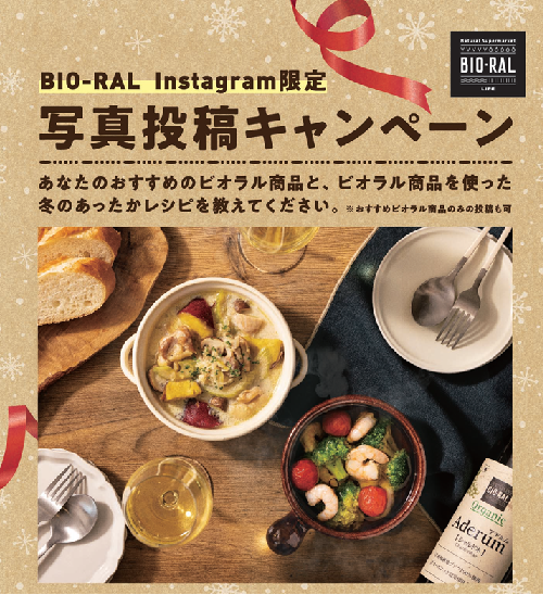 ※キャンペーンは2023年12月1日~31日の1カ月間、BIO-RALの公式Instagram(bioral_east/bioral_west)のフォロワーに向け、「おすすめのビオラル商品」または「ビオラル商品を使った冬のあったかレシピ」の画像を「#この冬食べたいおすすめ」のハッシュタグを記載し投稿を募集した。
