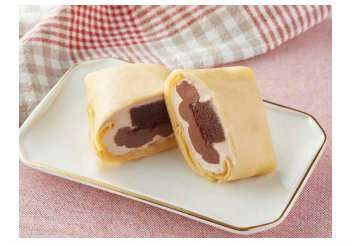 「しあわせクレープショコラ」は、チョコホイップとチョコカスタードに、ダイス状のチョコケーキをトッピングし、もちっと食感のクレープ皮で丁寧に包んだ。価格は218円。2月6日(火)から発売開始。