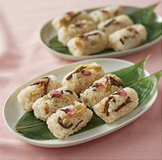 桜の花をトッピングして仕上げるおこわの素。桜の葉エキスを効かせただしで炊き上げることで、桜の風味が感じられるおこわに仕上がる。また、おこわに適している品種の熊本県産ヒヨクモチと鹿児島県産ヒノヒカリを合わせたおこわ米と、具材には山菜と油揚げもセットにした。2合用(2~3人前)で990円(税込み、以下同じ)。